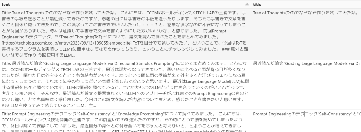 外部ドキュメントとして使用する、ブログ記事は以下のようなテーブル形式のデータに予めしておきました。 "text"カラムに本文が入り、"title"カラムに記事のタイトルを入れました。