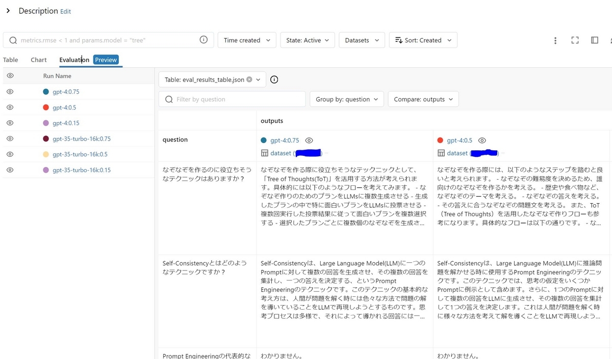 比較したい結果を複数選択しEvaluationタブをクリックすると、次のような画面が表示され、実行ごとの回答結果を比較することが出来ます。