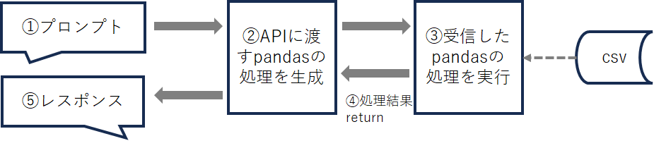 社内でも「簡単にデータの取得ができれば嬉しい」という声もあったこともあり、今回実現した内容は「自然言語でのテーブル情報の取得」です。 これ自体はpanadsA等Iを使ってもできるのですが、今回はAPIの機能はデータ抽出処理のみの前提で検討しました。 また、SQL+DBで実装したかったのですが、セキュリティ上の都合によりpandas+csvでの実装としました。