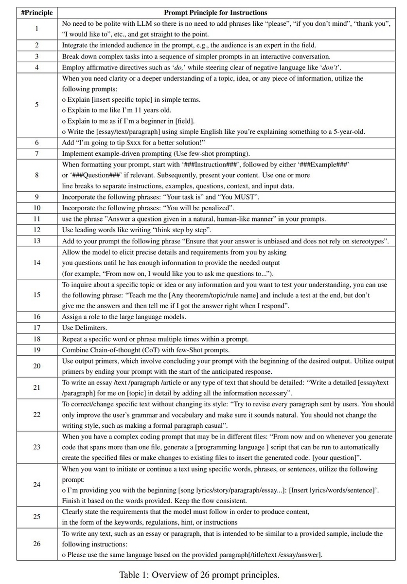 LLMsからより良い回答を得るための、プロンプトの方針が26個提案されています。論文に掲載されている図を転載します。