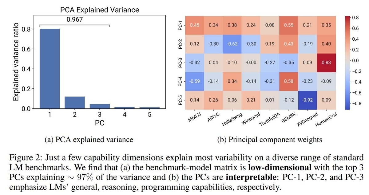 するとデータのばらつきの80%を第一主成分で、第一~第三主成分で96.7%を説明出来ていることが確認されています。各主成分ベクトルの要素を見ると、第一主成分は全てのベンチマークに関係するLLMの一般能力、第二主成分は推論、第三主成分はプログラミング能力に関連している、という結果が紹介されています。