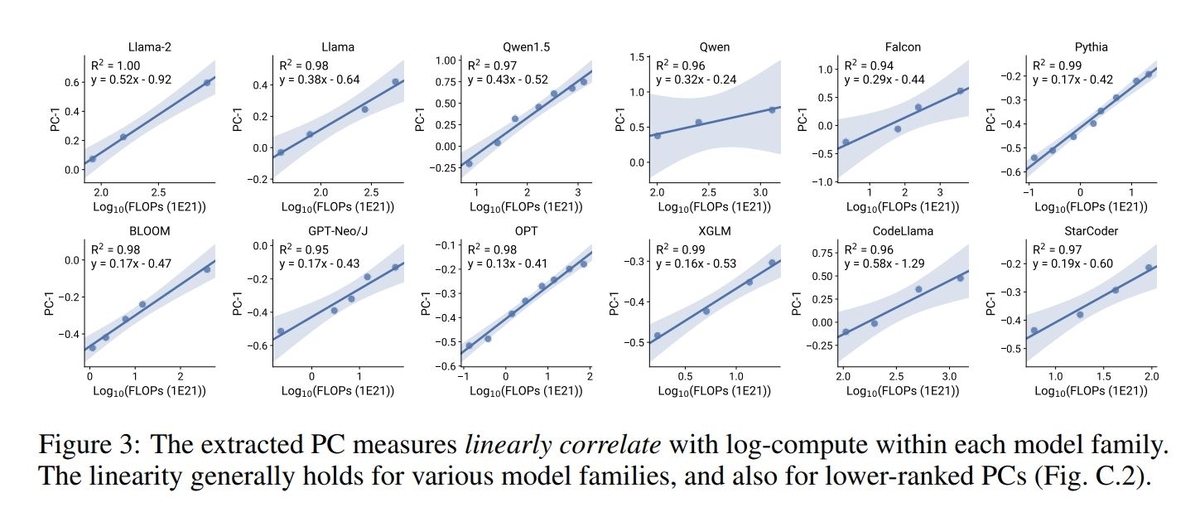 さらに各LLMの第一主成分のスコア(PC1)とFLOPsの間には対数線形の関係が確認されています。上位の主成分スコアを用いてFLOPs(の対数)の近似値を計算することで、Scaling lawsの近似計算が可能になります。
