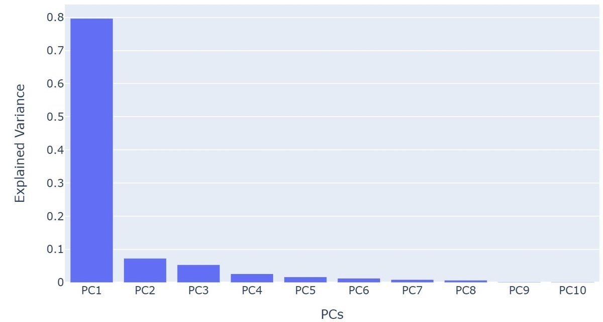 import pandas as pd import plotly.express as px explained_variance = pd.DataFrame( pca.explained_variance_ratio_, columns=["Explained Variance"] ) explained_variance["PCs"] = [f"PC{i+1}" for i in range(len(explained_variance))] fig = px.bar(explained_variance, x='PCs', y='Explained Variance') fig.show()