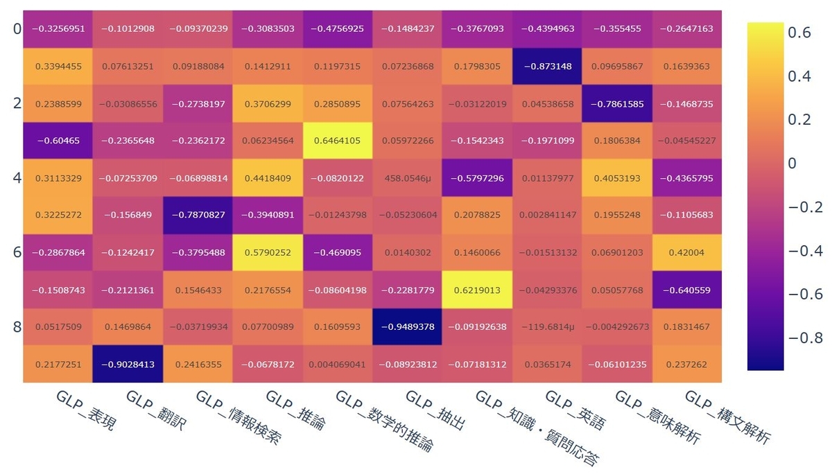 最初にNejumi LLMリーダーボード3の総合評価をCSVでエクスポートしました。今回は測定結果のうち汎用的言語性能 (General Language Processing, GLP)に該当するものを対象にしました。PCAの実行はscikit-learnを使用しました。