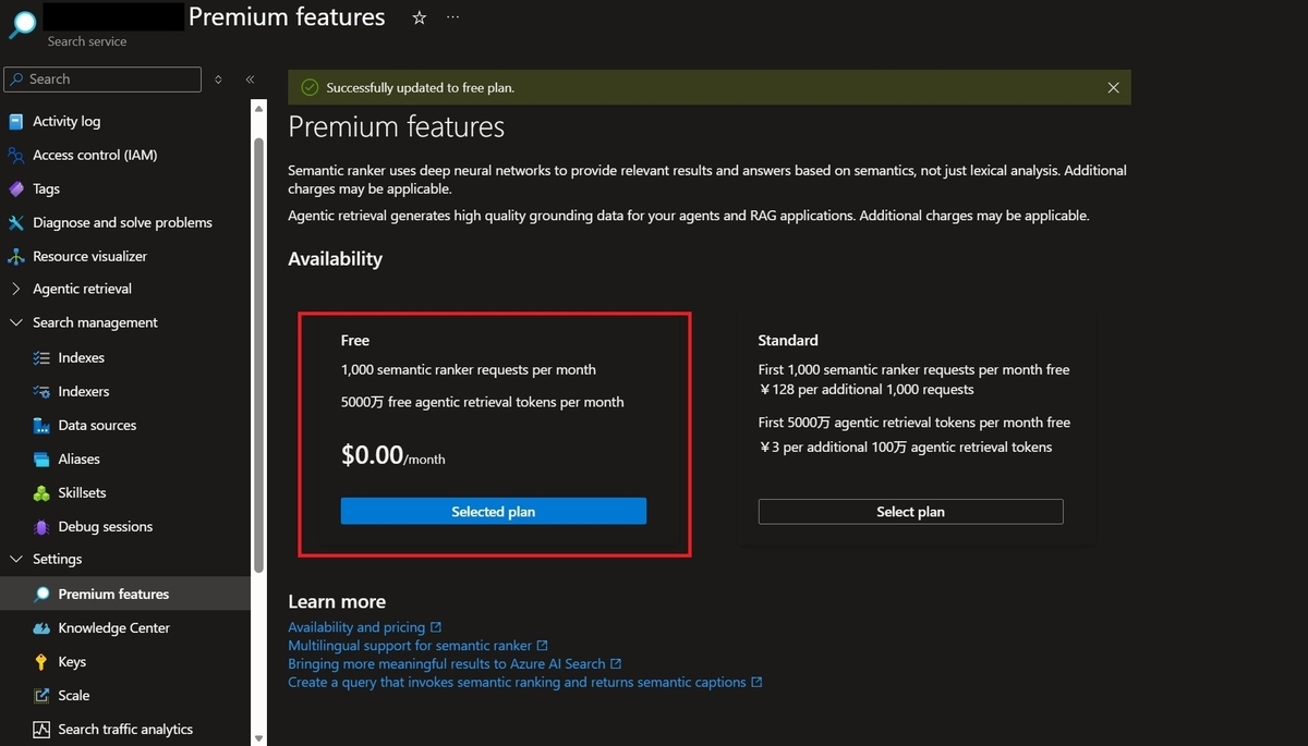 私がハマったポイントがここです。AI SearchをKnowledge Baseとして使う際には"Premium features"をONにしておく必要があります。AI Searchの"Settings"-"Premium feature"へと進み、FreeかStandardのいずれかのPlanを選択する必要があります。