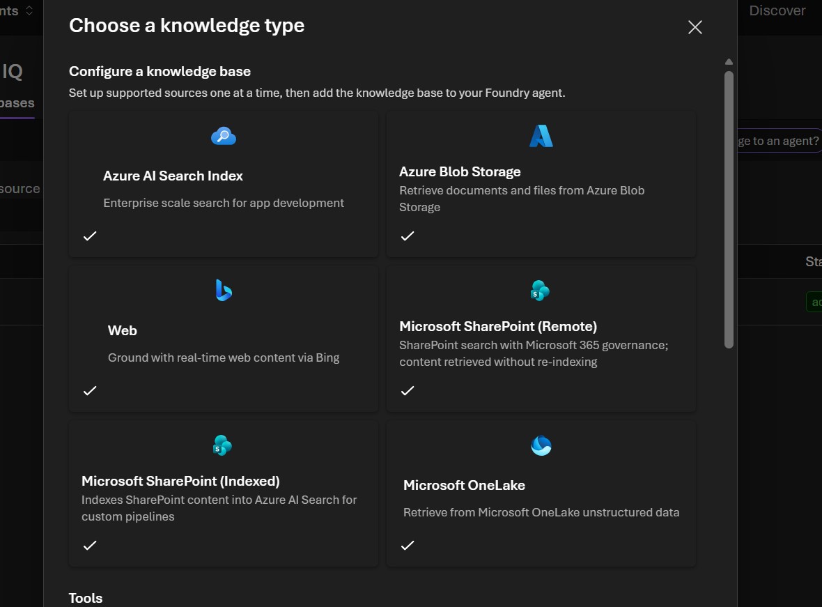 FoundryでAgentに与える知識はKnowledge Baseで与えることになります。Knowledge Baseは複数のKnowledge Sourceを束ねたもので、LLMを利用することで最適なKnowledge Sourceを選択して情報を提供する機能を提供します。