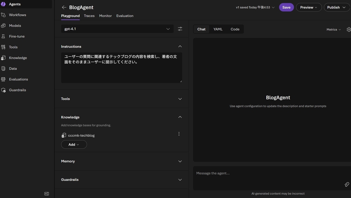ということで今回はMicrosoft FoundryでKnowledge Baseを作成し、Agentに参照させる手順についてまとめてみました。本当はコードで定義したAgentをデプロイする手順も調査していたのですがこちらもいくつかハマりポイントがあり、記事をまとめるまでに至りませんでした。まだ新しい機能なので、これから情報が充実していくとありがたいな、と思いますし、こちらのブログでも色々情報を発信していこうと思います。